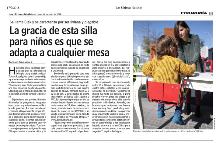 EMPRENDEDORES Pareja chilena de emprendedores crea innovadora silla plegable para niños por Agenda País, El Mostrador / 3 de julio,...
